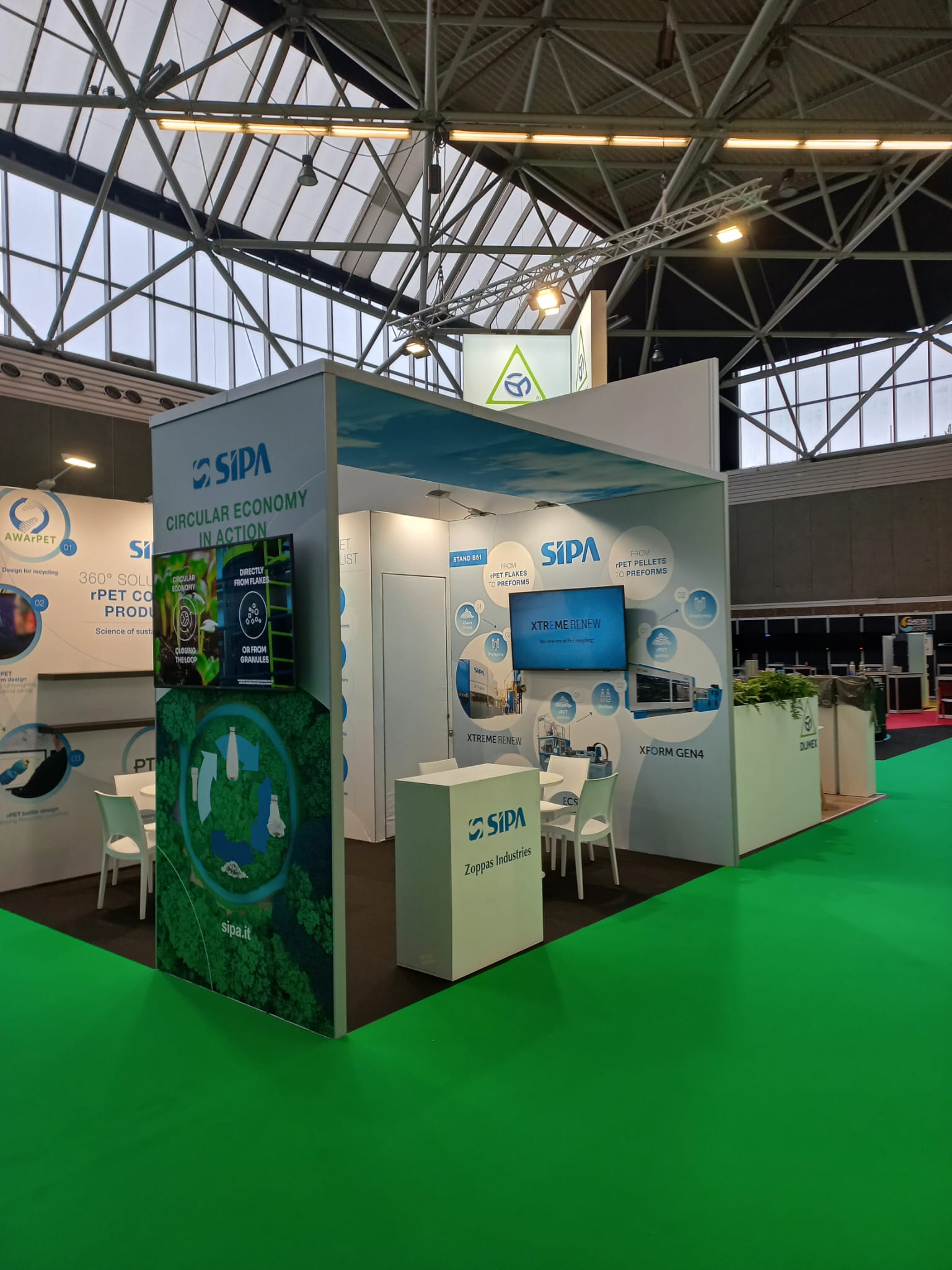 Het vaste plafond zorgt voor een rustige, afgebakende uitstraling en maakt het mogelijk om verlichting netjes te integreren. Dankzij de hoekpositie is de stand zichtbaar vanuit meerdere richtingen en heeft deze een duidelijke aanwezigheid op de beursvloer.